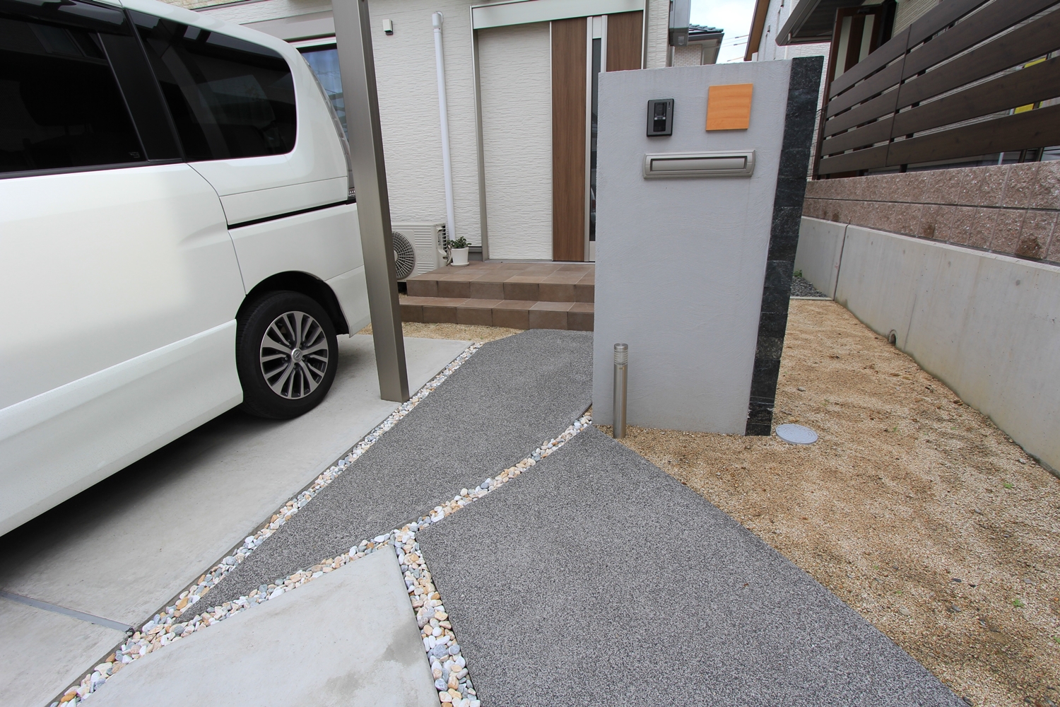 アプローチは、洗い出しを使い、門柱に合わせてモノトーンでシンプルなものにしました。