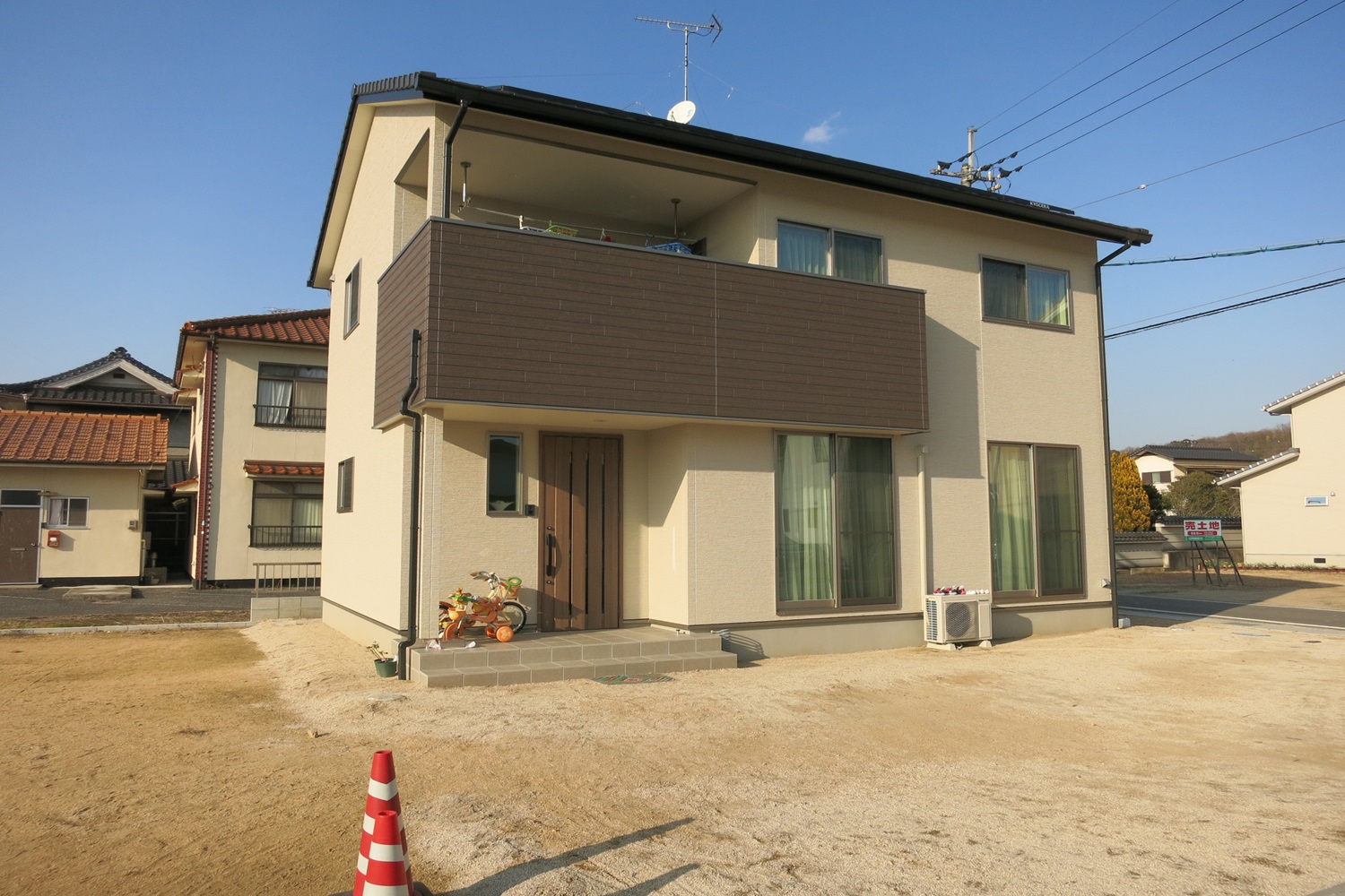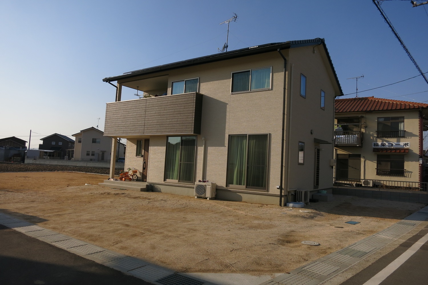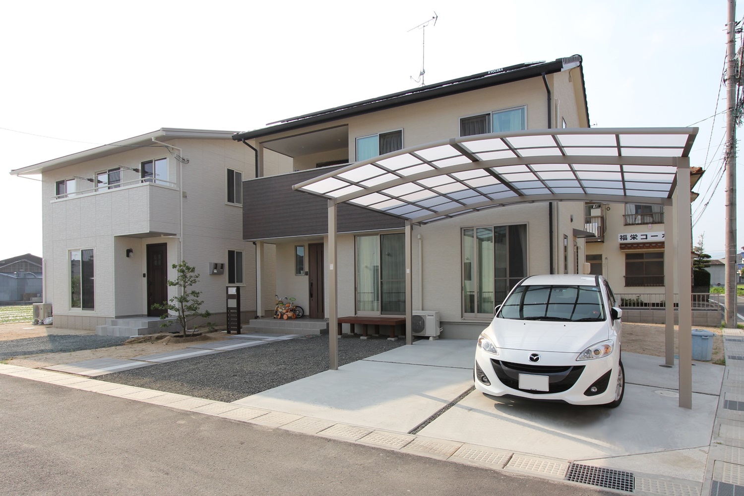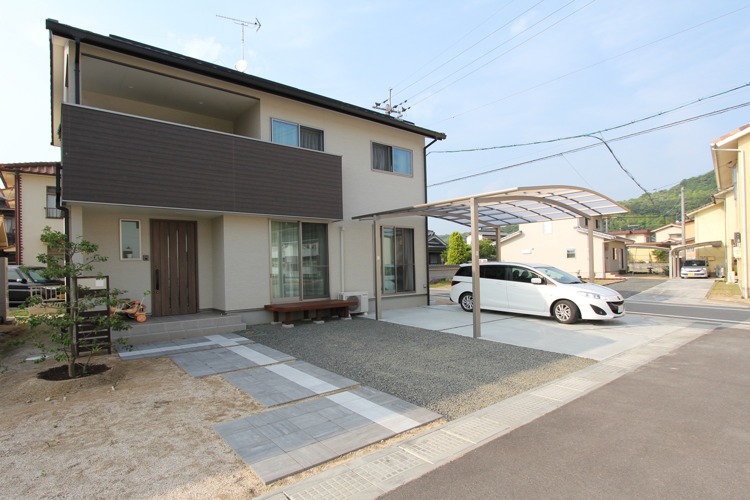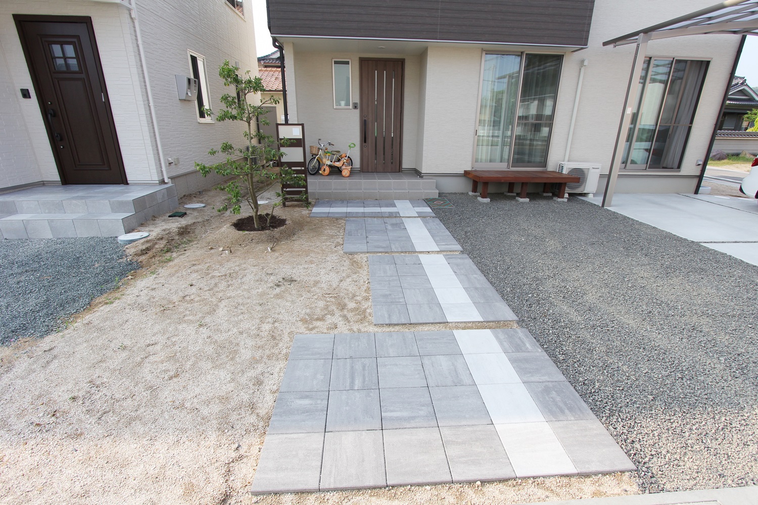 | 工事内容 | 駐車スペース:土間コンクリート打ち、カーポート アプローチ:300角平板 機能門柱、表札、ウッドデッキ、防草シート、バラス敷き、植栽 |