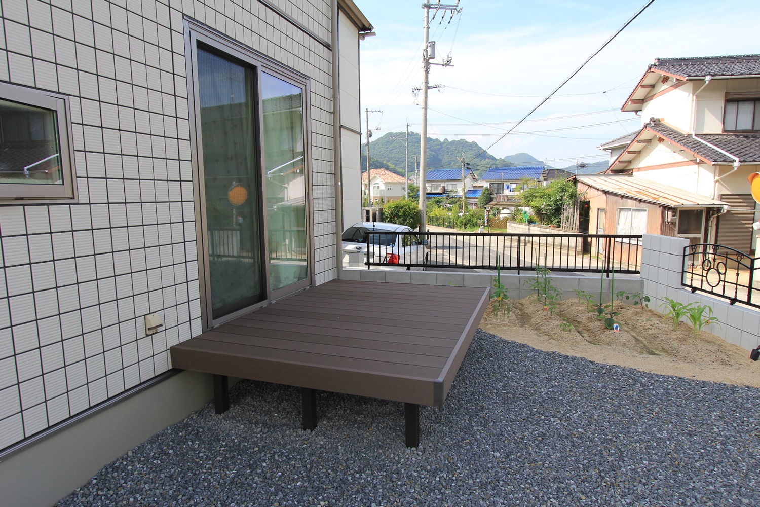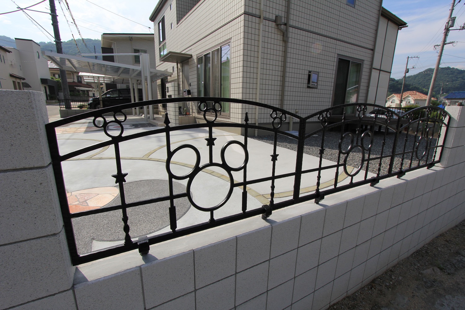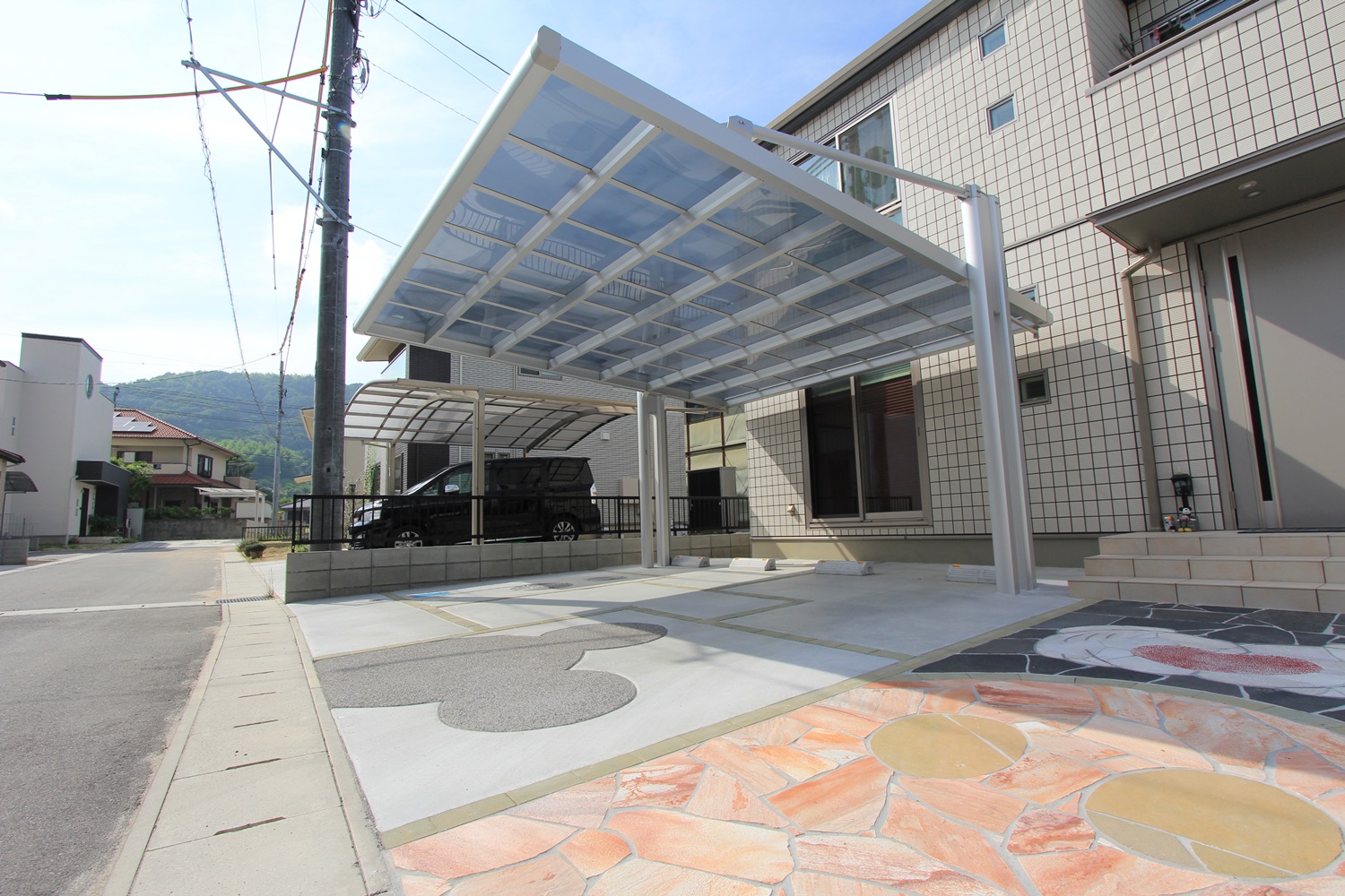 | 工事内容 | 駐車スペース:土間コンクリート打ち、コンクリート洗い出し、インターロッキング、石貼り、カーポート、車止め アプローチ:石貼り、クリスタルぺブル、インターロッキング 境界ブロック:化粧ブロック積み、ディズニーフェンス、ブロック飾り、CB150積み、メッシュフェンス 門柱:CB120積み、タイル貼り、口金ポストウッドデッキ、防草シート、バラス敷き |