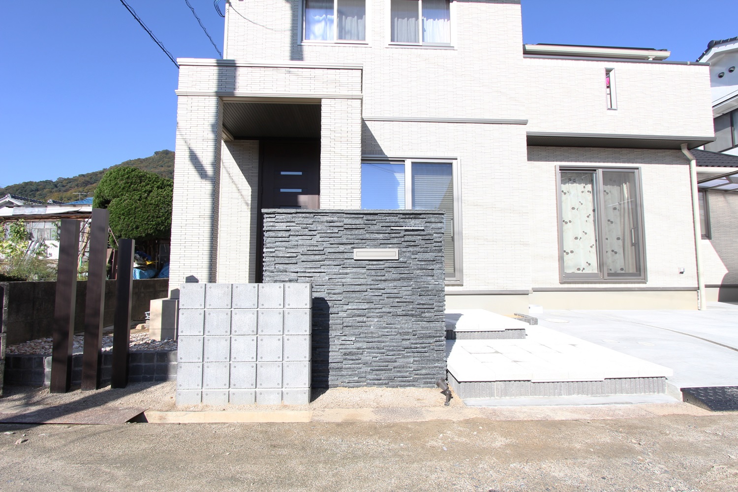 こだわりの石貼りの門柱がかっこいいオープン外構