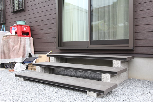 ウッドデッキ材で踏み面を広めにとり、幅は窓枠いっぱいに広げ、ゆったりと上がり降り出来るようになりました。