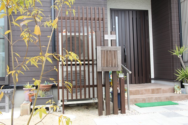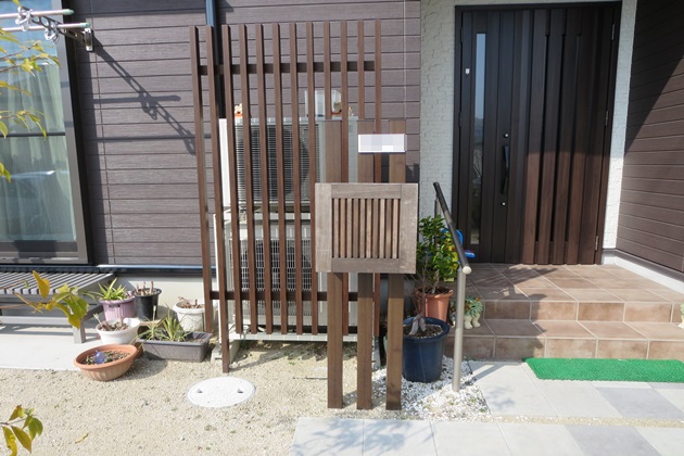 角柱門柱に並べて、木目調のポールライトを設置しました。木目は室外機の目隠しに使用した千本格子と同色です。