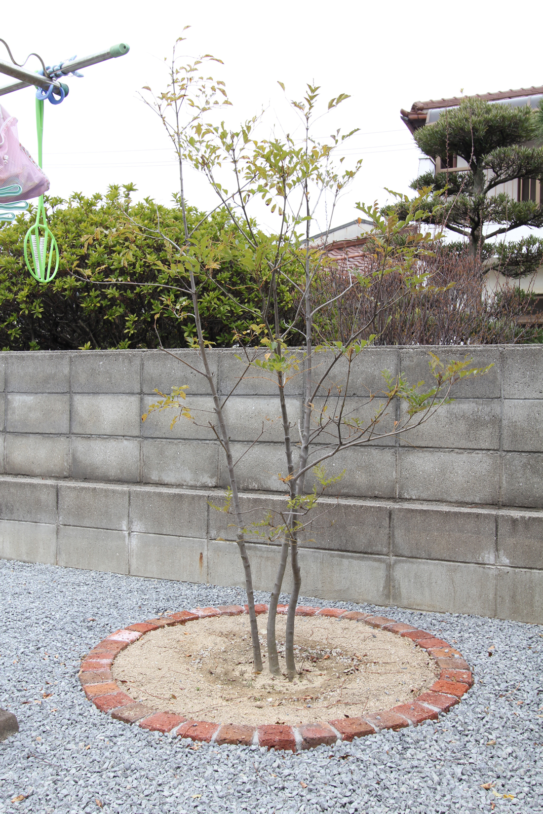 周りに防草シートとバラスを敷き詰める為、幹の周りをレンガで縁取りしました。