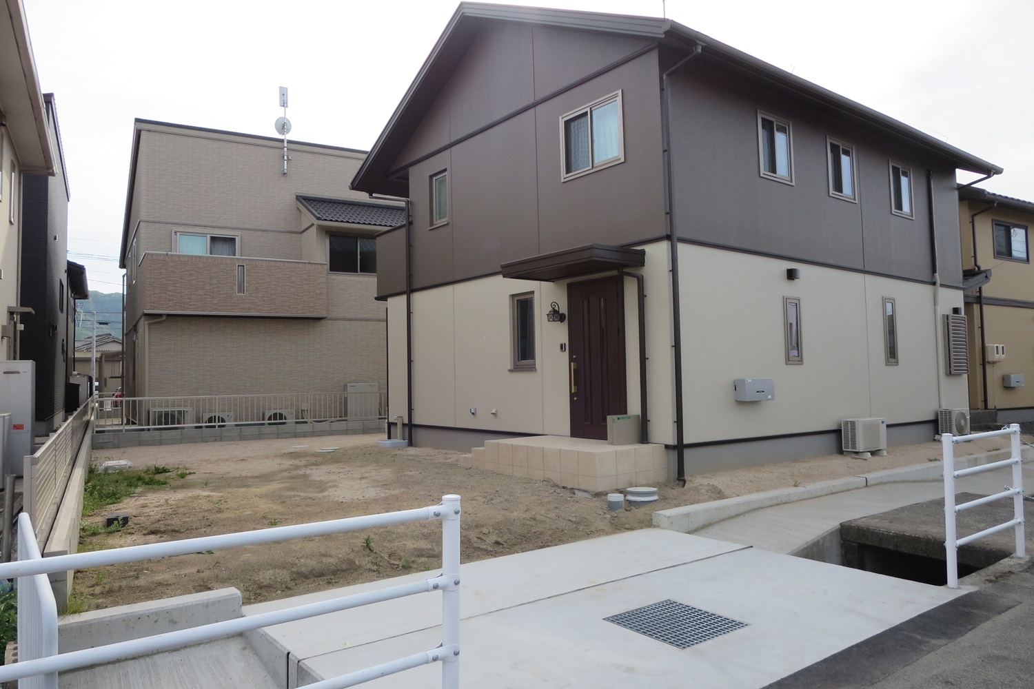 アプローチをアールにカットし駐車スペースの間に設けたスペースには下草や草花を植えて頂ける植栽スペースです。