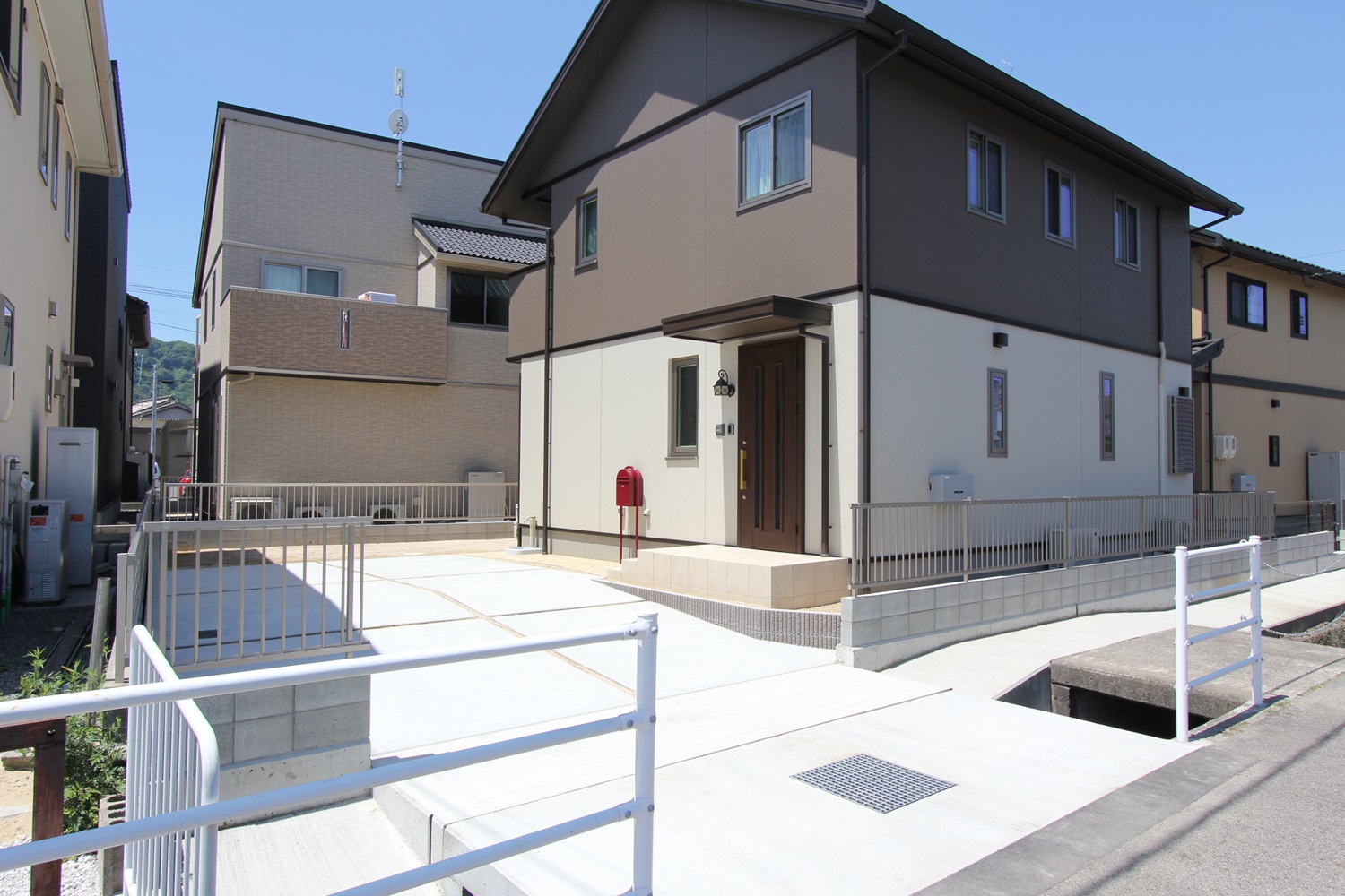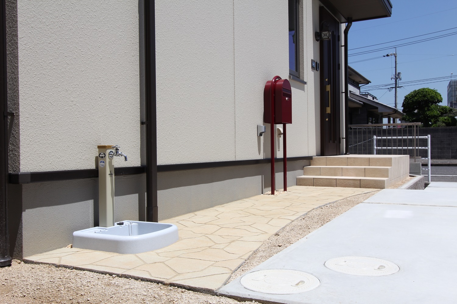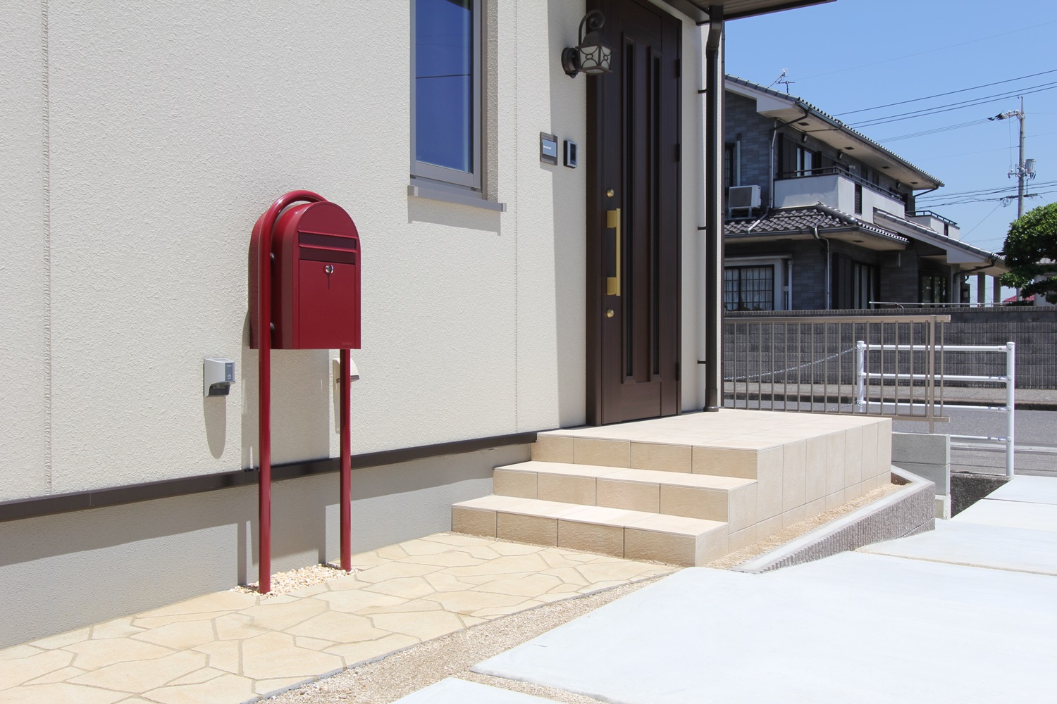 玄関ポーチと色を似せたアプローチのワンポイントはポスト!