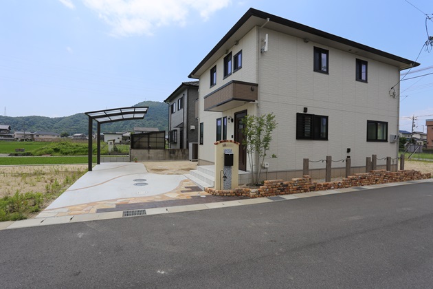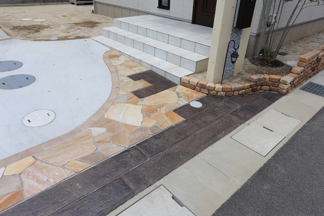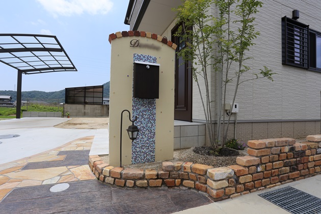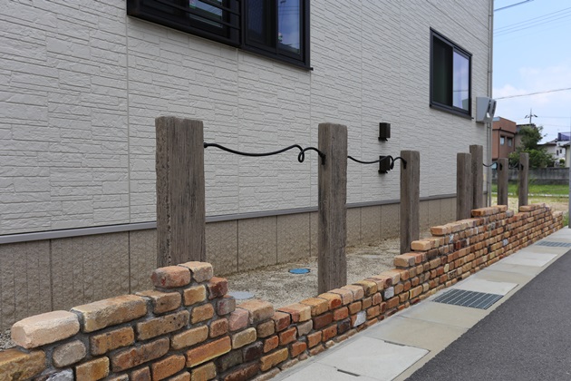 | 工事内容 | 境界:CB積み、ハイグリッドフェンス 門柱:塗り壁仕上げ、福彫表札、ボーノグレインポスト 袖壁:アンティークレンガ積み、レイルスイーパーラフト+ルーズバーツイスト アプローチ:乱形石貼り、MATスタンプビンテージウッド 駐車スペース:土間コンクリート打ち、ラインインターロッキング |