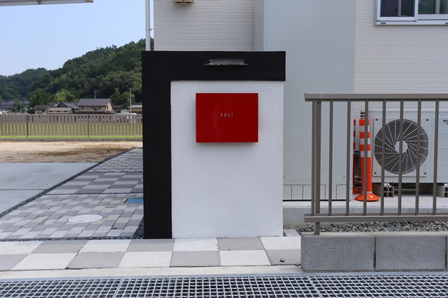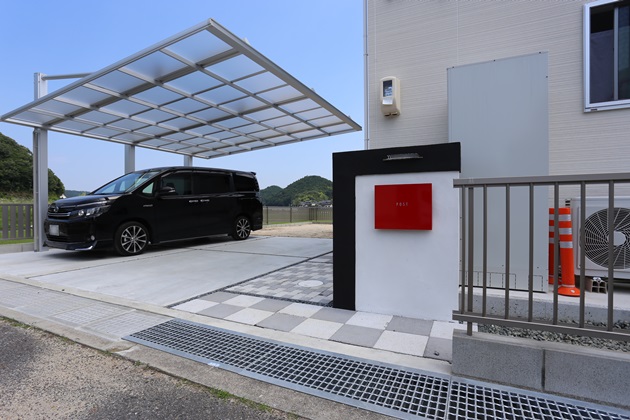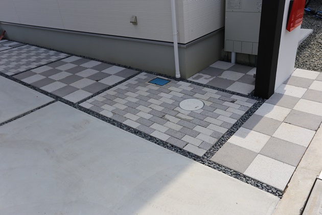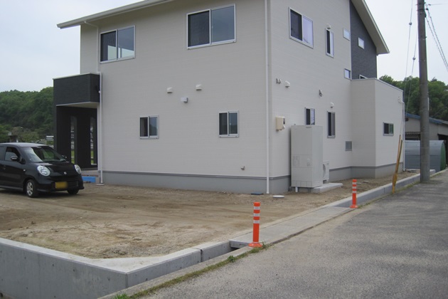| 工事内容 | 境界:CB積み、縦格子フェンス 門柱:塗り壁仕上げ、ステンレス表札、パーサスネオPLAINポスト 袖壁:化粧ブロック、縦格子フェンス アプローチ:ドゥ・ステップ 駐車スペース:土間コンクリート打ち、スリット(玉砂利) その他:バラス敷き、インターロッキング |