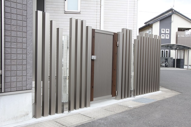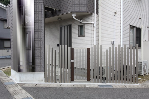 門扉は玄関扉に似たデザインで両サイドに木調があしらわれています。