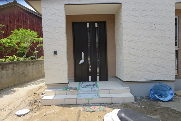 水勾配の関係で、アプローチの高さは玄関ポーチの1段目に合わせています。
