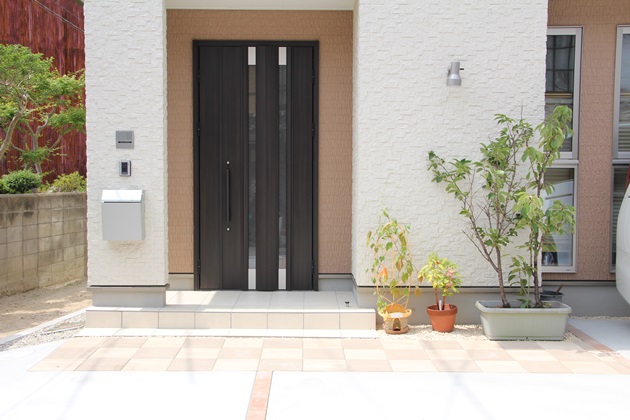 | 工事内容 | アプローチ:300角平板敷き 駐車スペース:土間コンクリート打ち、インターロッキング、U字溝+グレーチング テラス:フラット屋根タイプのテラス、水切り、特注框ドア その他:表札・ポスト、防草シート+バラス敷き、まき砂利敷き、縁石、土留め |