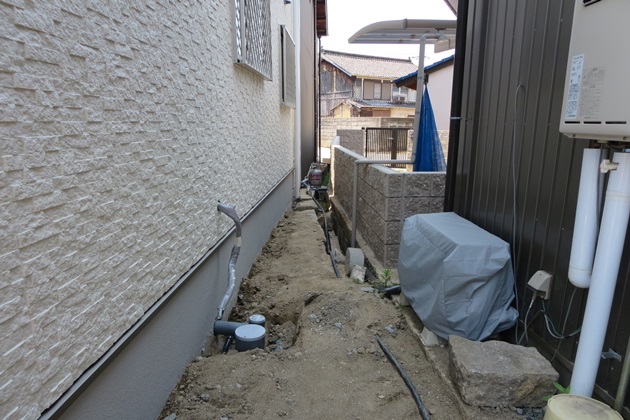 ここの場所には室外機を4台設置予定との事で枠を立てコンクリートを流し込み崩れないように固定し室外機が設置できるようにしました。