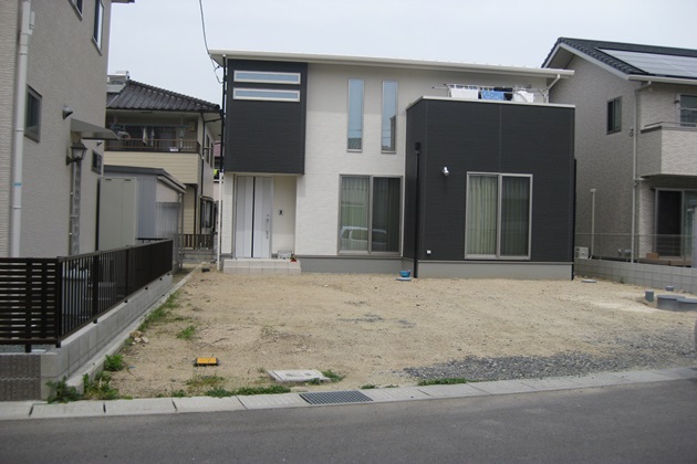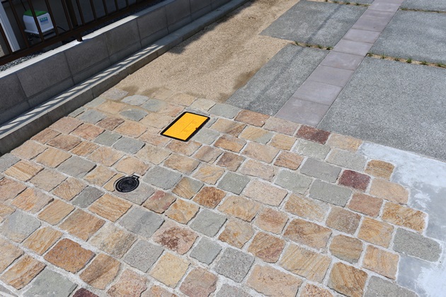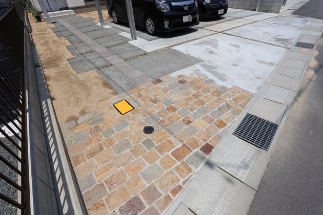 | 工事内容 | アプローチ:300角平板、ラジャストーン 駐車スペース:フラット屋根タイプカーポート3台分、土間コンクリート打ち、スリット 境界:CB積み、アルミ縦格子フェンス 門柱:アルミ機能門柱、ガラス表札、縦型ポスト その他:テラス、立水栓移設、テラス、真砂土整地、ハナミズキ |