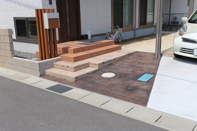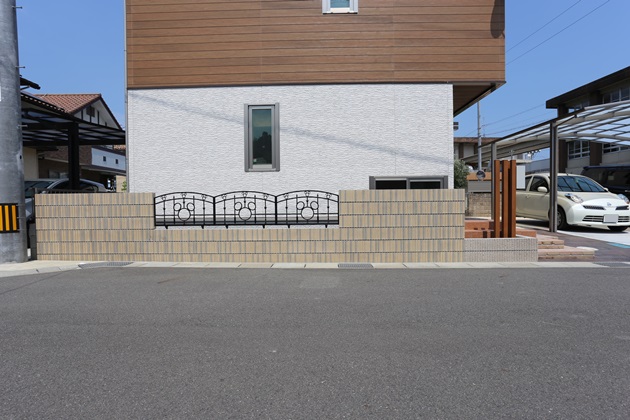 | 工事内容 | 境界:化粧ブロック積み、メッシュフェンス、アルミ鋳物フェンス 門柱:アルミ角柱立て、木調ポスト アプローチ:スタンプコンクリート 駐車スペース:Rタイプ2台分カーポート、土間コンクリート打ち ライン:インターロッキング土留めCB積み、乱形石貼り(ワンポイント) |
