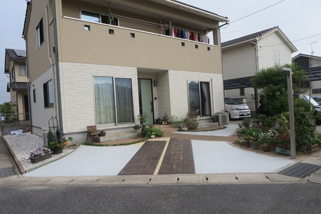 | 工事内容 | 駐車スペース:MATスタンプ(ビンテージウッド)、土間コンクリート打ち 縁:ベイクブリック その他:まき砂利敷き、防草シート敷き、L字角柱立て |