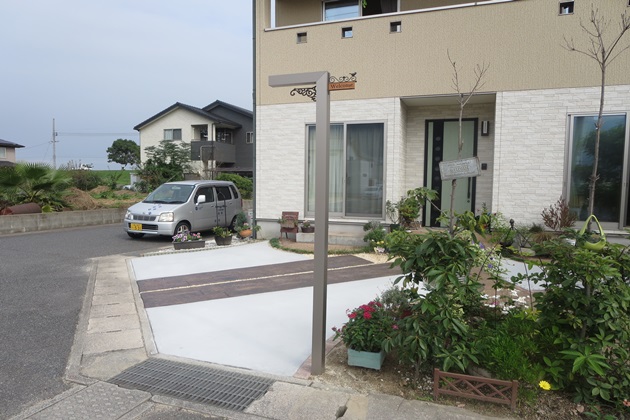 草花に相性の良いビンテージウッドをアクセントにコンクリートを施工し、来客時の駐車スペースを設けました。